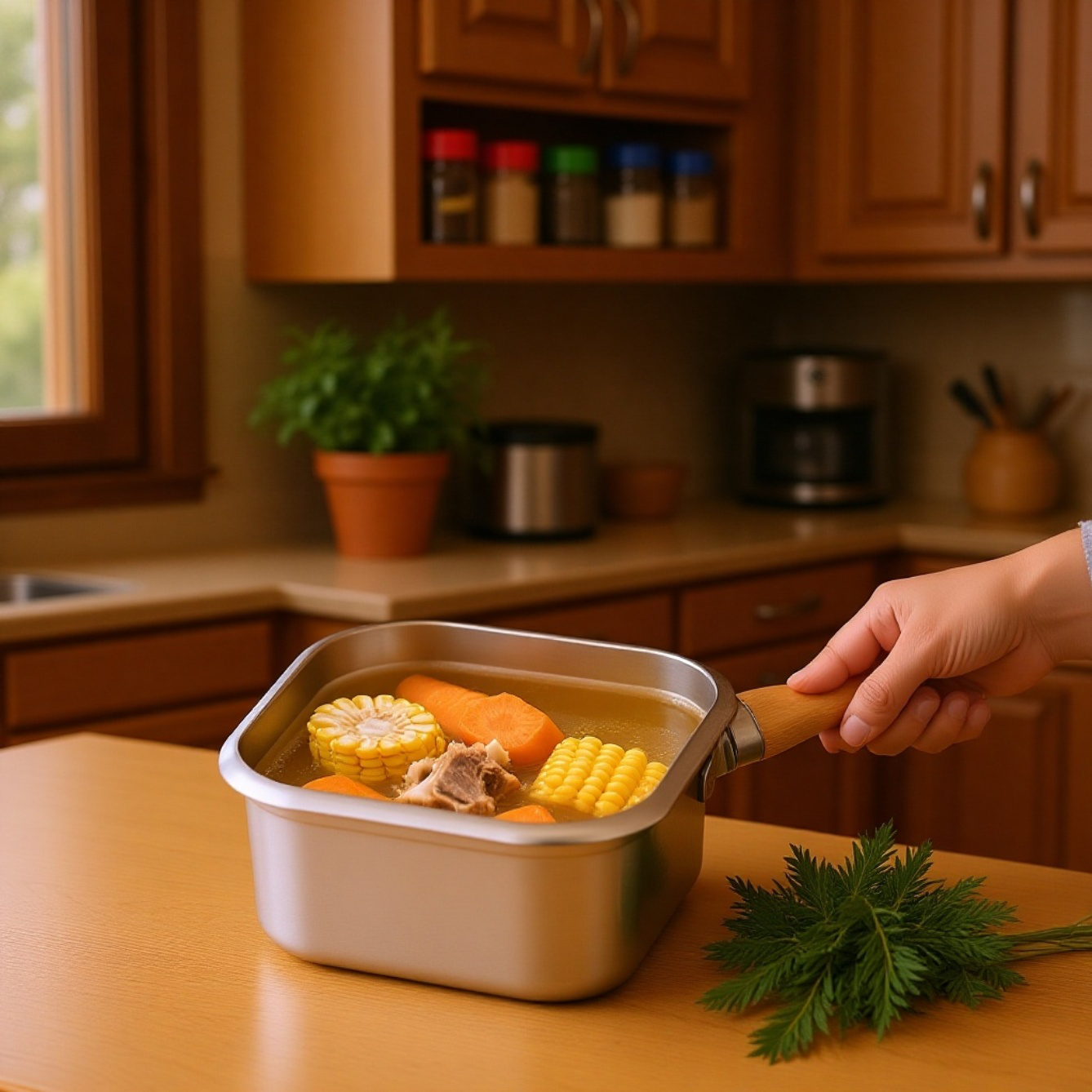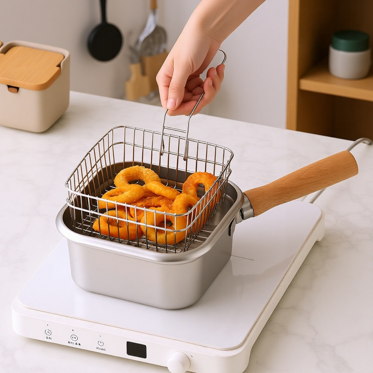 ● スクエアデザインで麺類や揚げ物、ミルク温めなど多用途に活躍し、キッチンの幅広いシーンに対応します。